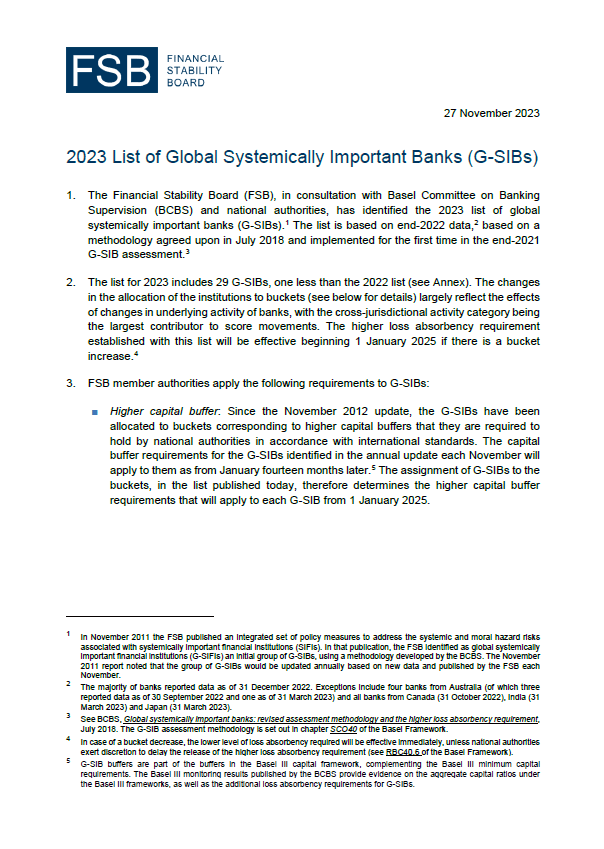 You can access the annual FSB updates regarding the banks which are identified as G-SIBs, in addition to details of the ‘buckets’ (which determine the level of additional Tier 1 capital ratio required) which each bank sits in, via the following links: